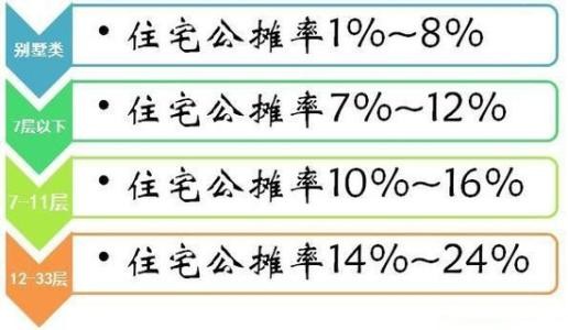 多楼层的住房,国家明确规定,在7层以下的住宅的公摊率是7%—12%。多楼层建筑的楼层数指得是在6层左右的磗混合的建筑,而其他的公摊部分的面积也包括外墙的水平投影的二分之一楼梯、楼梯间以及为每位住户所提供的服务业务的用房(热水交换站、水泵房、配电室等等)。一般情况下,这些会占我们住房建筑面积的13%—18%。